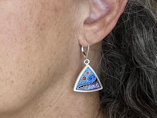 Cloisonné Enameled Triangle Earrings with Silver Washers - Ice Color Palette