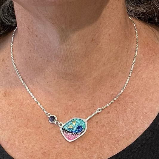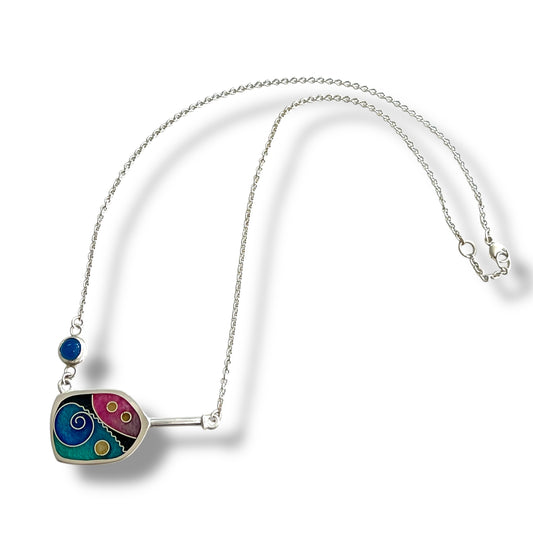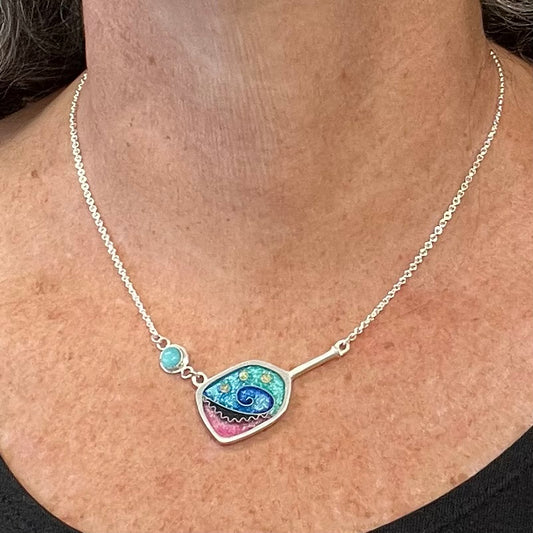 Cloisonné Enameled Pickleball Paddle and Ball Necklace - Ocean Color Palette