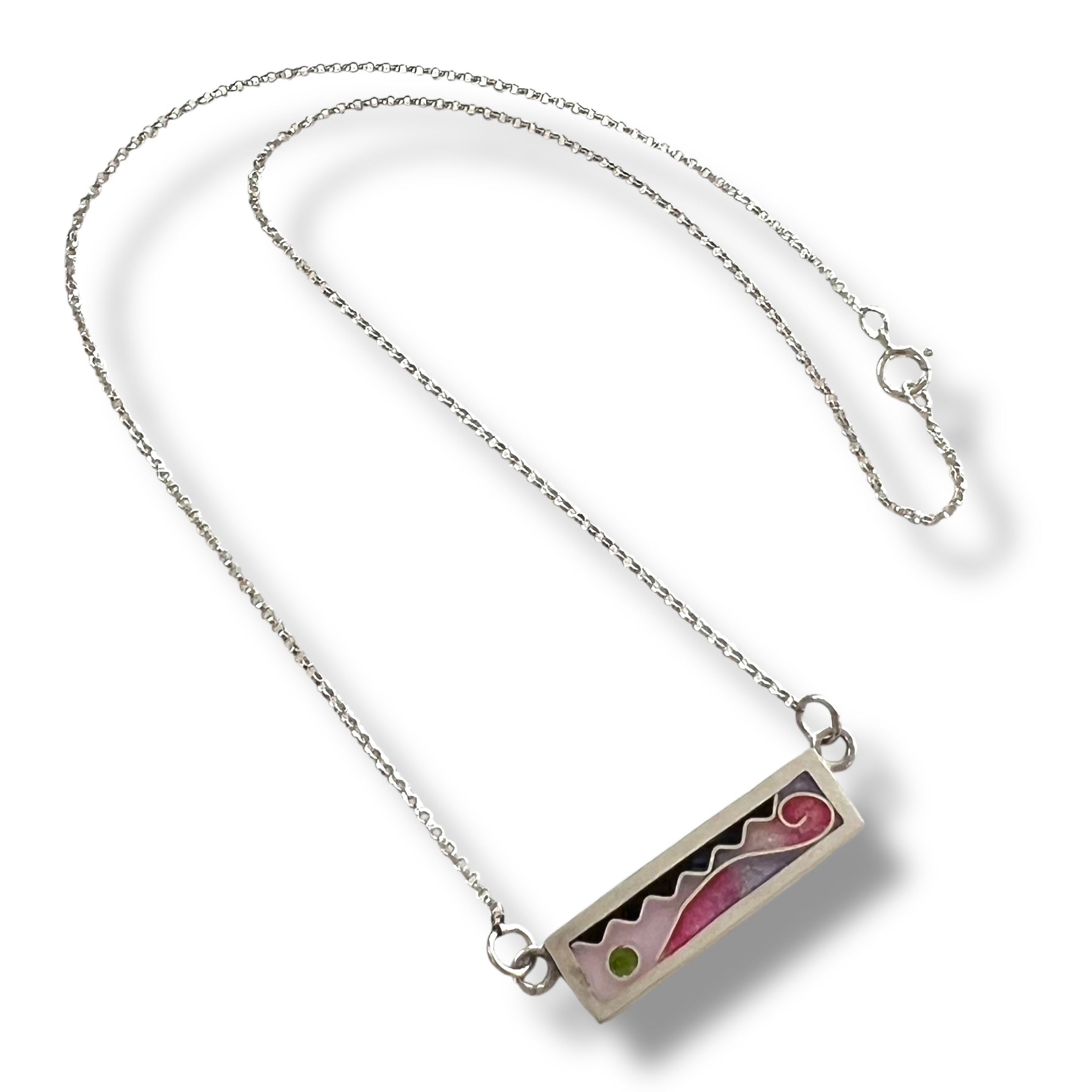 This one-of-a-kind cloisonné enameled necklace features a sleek, contemporary design with a rectangular pendant measuring ⅜ inch by 1⅛ inch.The pendant is set in fine silver, complemented by a sterling silver chain that measures 17½ inches in length. However, I am happy to adjust the length to suit your preference, ensuring a perfect fit for you. This necklace is perfect for the woman who appreciates unique, handcrafted jewelry that stands out as an elegant piece of wearable art. This piece is created in the Cherry Blossom color palette—a blend of soft pinks, lavender, and delicate greens, inspired by the beauty of nature in bloom.