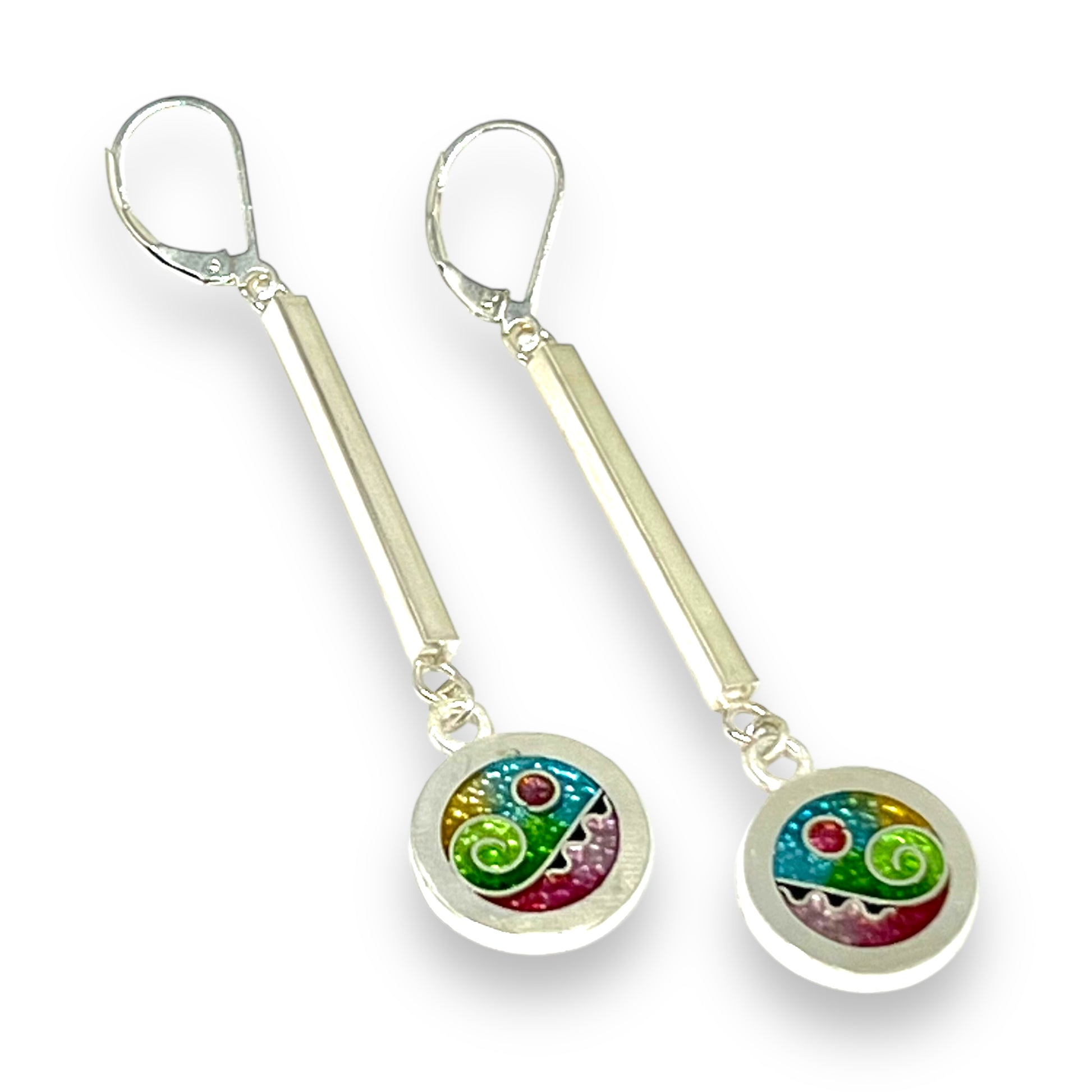 These Cloisonné enameled Circle/Bar earrings are a perfect blend of modern design and vibrant color, handcrafted to capture the essence of the Meadow color palette, a striking combination of green, blue, fuchsia, and a hint of yellow. The enameled circle, measuring ⅝ inch, is attached to a sleek sterling silver bar, creating an elegant dangle that measures approximately 2½ inches in total length.