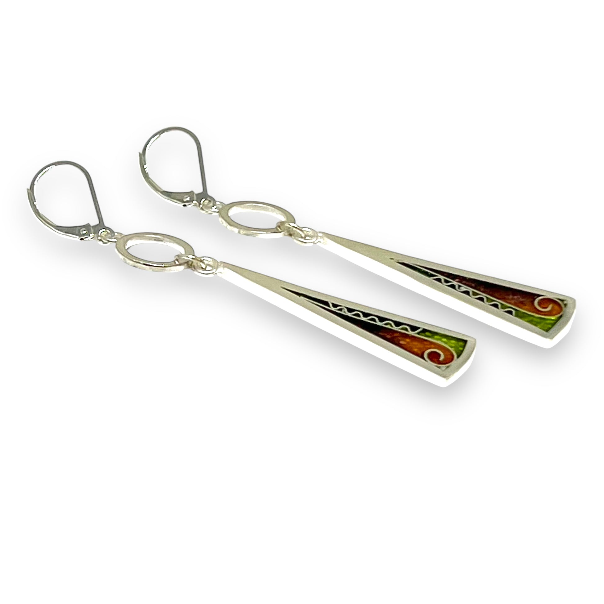 Elevate your style with these exquisite contemporary cloisonné earrings, meticulously handcrafted in fine and sterling silver. Designed with a sleek, modern aesthetic, the earrings feature long, slim triangles measuring ⅜ inch wide and 1½ inches long, with a total length of 2¾ inches. As an award-winning enamel artist, each pair of earrings I create is truly one of a kind, making them perfect for those who love to collect wearable art. The traditional cloisonné technique, paired with a contemporary design, makes these earrings a striking statement piece for any occasion. Each earring is enameled in the exclusive Desert color palette, featuring rich tones of burgundy, gold, and muted green, inspired by my home in Arizona.