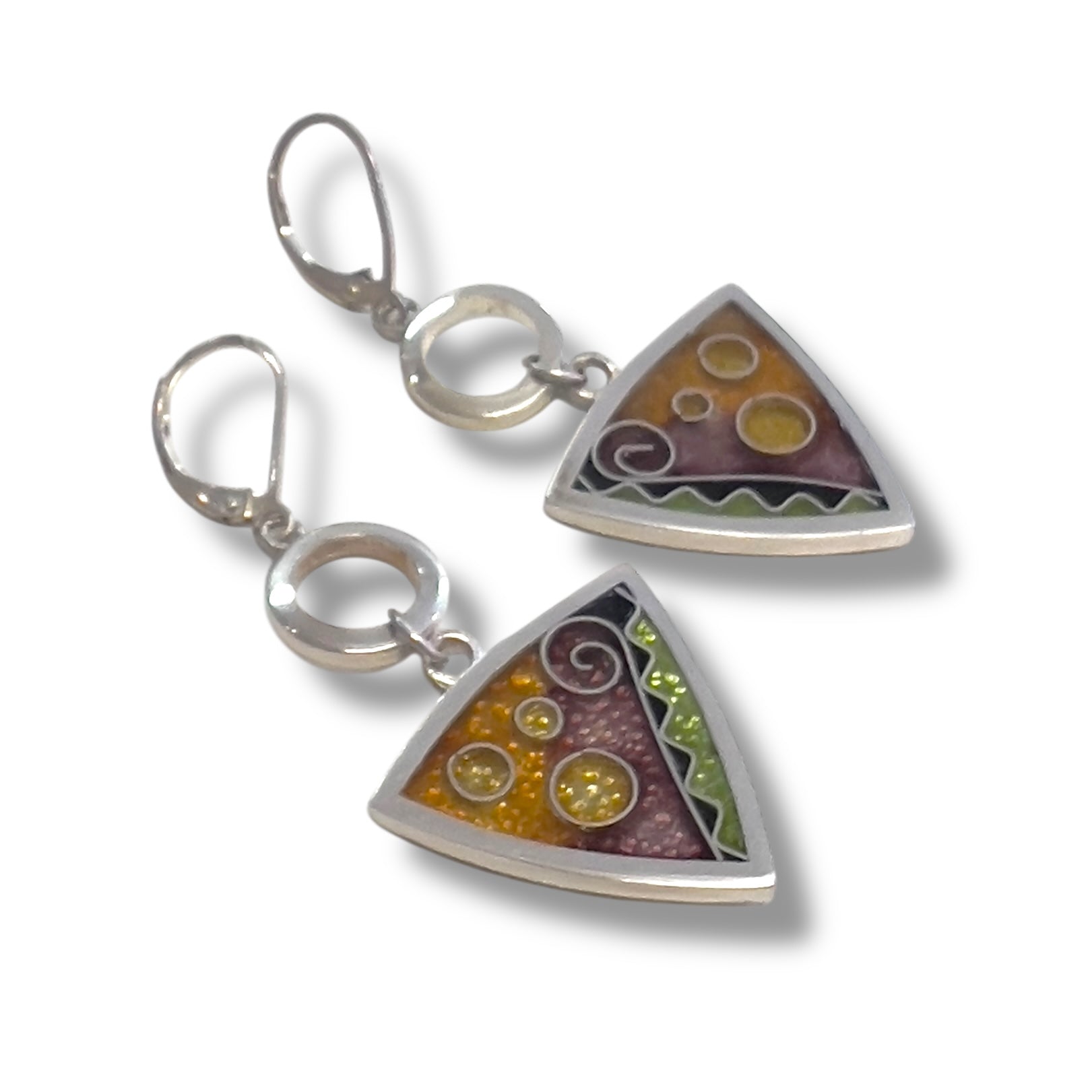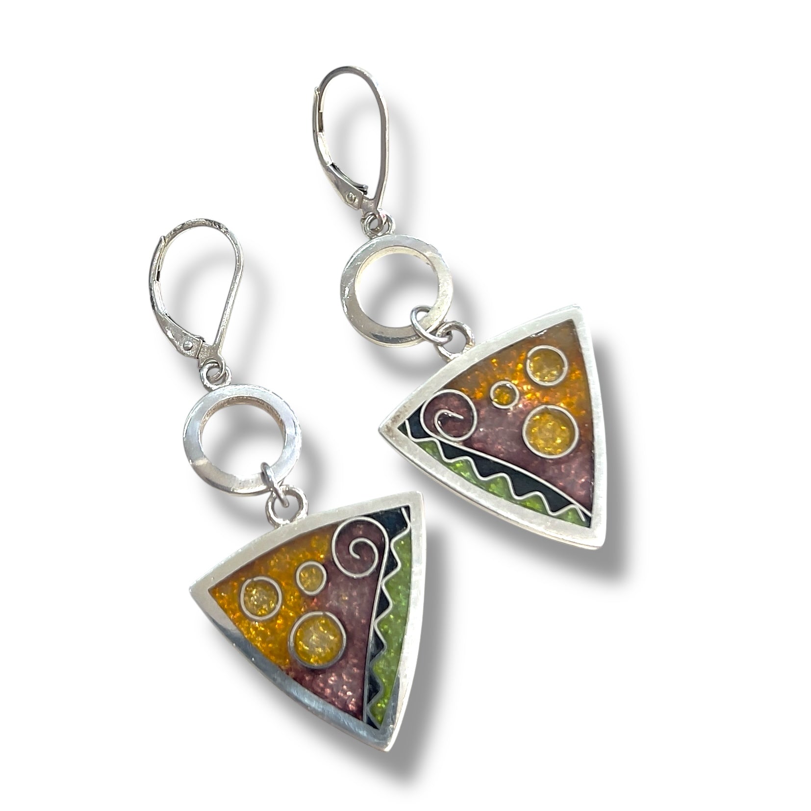 Cloisonné Enameled Triangle Earrings with Silver Washers - Desert Color Palette